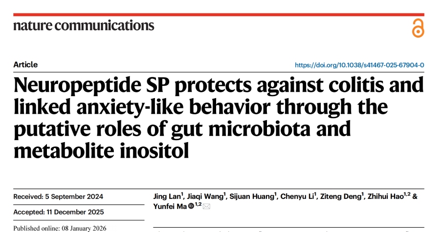 近日,中國農業(yè)大學(xué)團隊在Nature?Communications(IF=15.7)發(fā)表重磅研究:“Neuropeptide?SP?protects?against?colitis?and?linked?anxiety-like?behavior?through?the?putative?roles?of?gut?microbiota?and?metabolite?inositol”。