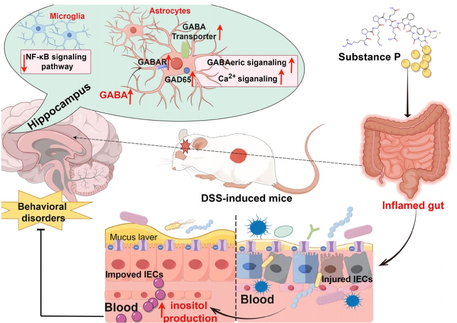 SP通過(guò)調節腸道菌群結構,促進(jìn)有益菌群產(chǎn)生肌醇;肌醇進(jìn)入循環(huán)后作用于海馬體,一方面抑制小膠質(zhì)細胞NF-κB促炎通路,減輕神經(jīng)炎癥;另一方面激活星形膠質(zhì)細胞GABAergic/Ca2?信號通路,增強抗焦慮神經(jīng)傳導;最終實(shí)現對結腸炎的腸道保護與焦慮樣行為的神經(jīng)調節,形成“SP-腸道菌群-肌醇-海馬體”的完整調控軸。