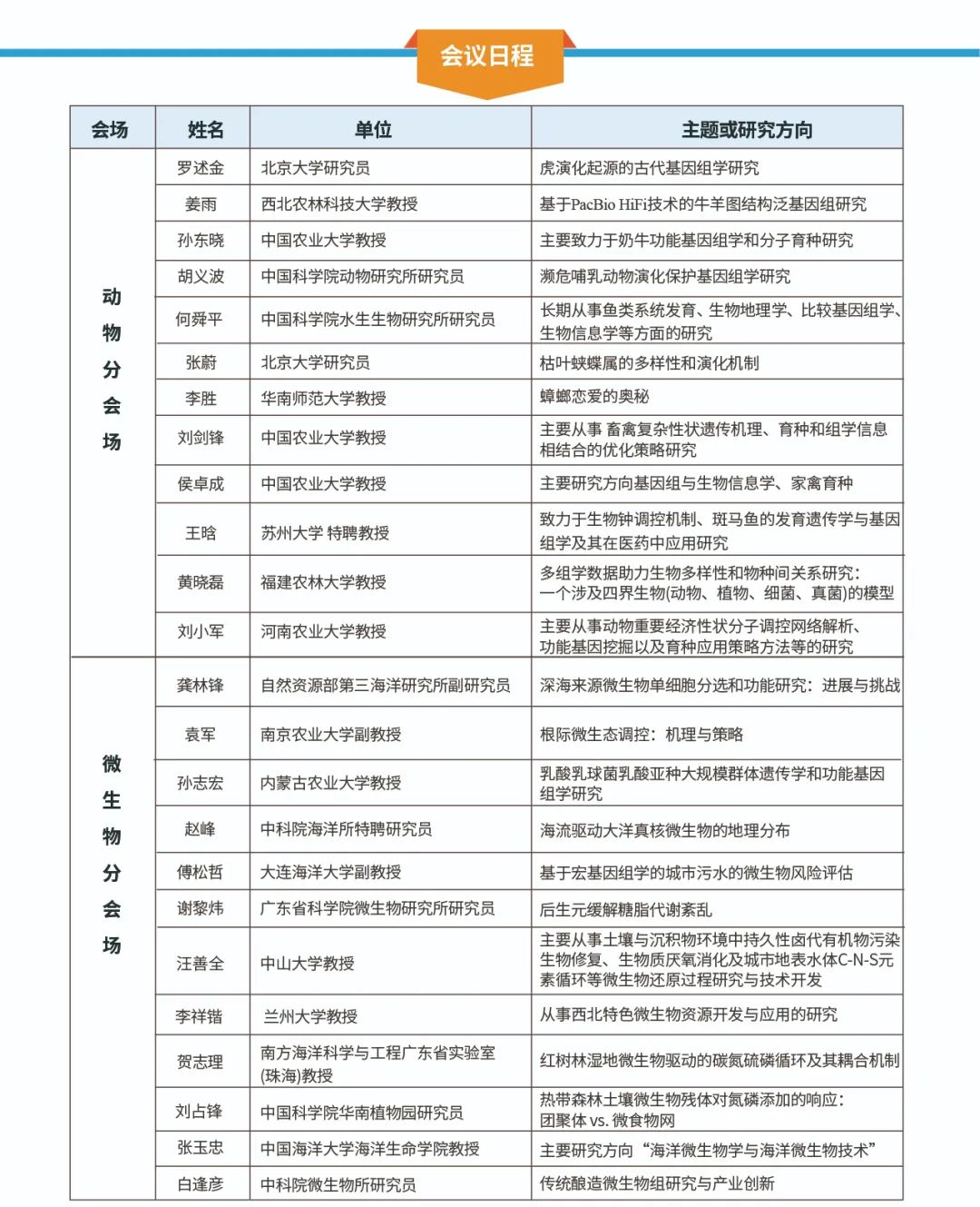 生物大數據是21世紀具有創(chuàng )新力活躍的技術(shù)領(lǐng)域。完整基因組構建、動(dòng)態(tài)三維調控、功能基因定位、蛋白&代謝等多組學(xué)技術(shù),在動(dòng)物功能研究上日臻成熟。如何利用大數據解析遺傳潛能已成為科研學(xué)者重點(diǎn)研究方向。為了展示和交流動(dòng)物遺傳學(xué)領(lǐng)域的新成果、新進(jìn)展,共同探討動(dòng)物領(lǐng)域的熱點(diǎn)、難點(diǎn)問(wèn)題,本會(huì )場(chǎng)特邀動(dòng)物領(lǐng)域專(zhuān)家學(xué)者,圍繞動(dòng)物起源進(jìn)化及遺傳多樣性、動(dòng)物育種及重要功能性狀遺傳機制解析等主題,分享研究進(jìn)展及經(jīng)驗成果。