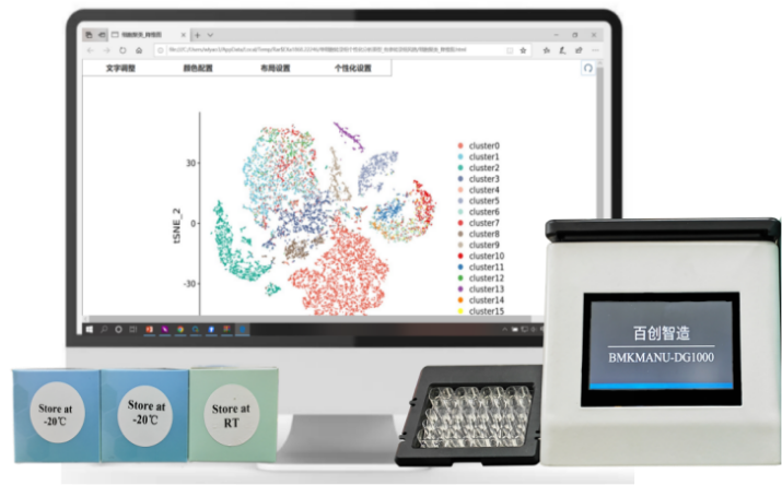 為了突破單細胞試劑耗材及儀器長(cháng)期以來(lái)的國外技術(shù)壟斷,降低單細胞應用的成本,讓單細胞技術(shù)能夠惠及更多的科研群體,經(jīng)過(guò)多年潛心研發(fā),百創(chuàng )智造發(fā)布自主研發(fā)的極速單細胞微液滴系統-百創(chuàng )DG1000。百創(chuàng )DG1000是基于微流控、油滴包裹和Barcode標記等技術(shù)來(lái)實(shí)現高通量的細胞捕獲。除了儀器以外,百創(chuàng )DG1000還有配套的2×4的獨立芯片及配套試劑盒(圖4)。