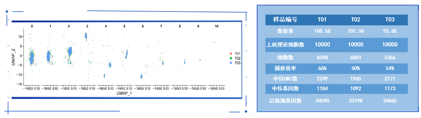 PBMC重復性檢測:將相同的PBMC細胞懸液分3份,通過(guò)3個(gè)不同實(shí)驗人員,用3臺百創(chuàng )DG1000儀器,獨立進(jìn)行單細胞測序,得到了幾乎一致的細胞聚類(lèi)分群結果,證明百創(chuàng )DG1000具有很好的可重復性及穩定性(圖5)。