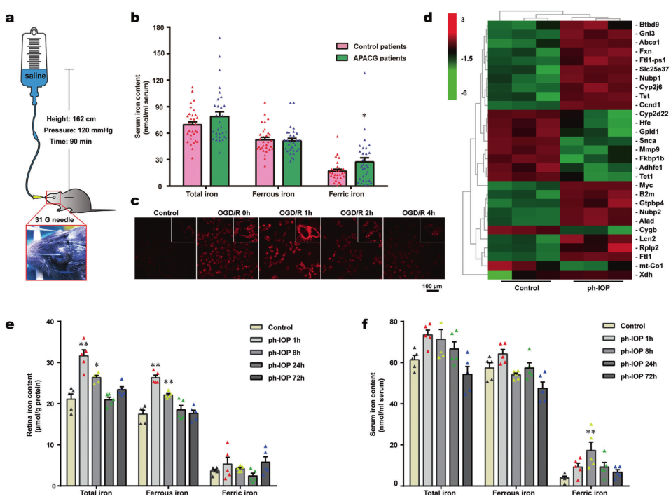 2. 體外和體內實(shí)驗證實(shí)了,ph-IOP可以在損傷早期導致細胞和視網(wǎng)膜內二價(jià)鐵離子異常積累,損傷后8h血清中三價(jià)鐵離子水平升高;