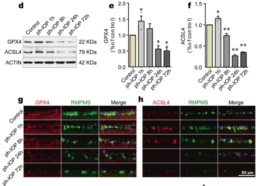 為了驗證PH-IOP損失引起的視網(wǎng)膜鐵積累可能導致視網(wǎng)膜鐵死亡這一假設,測量了氧化應激相關(guān)生化指標,發(fā)現Ph-IOP損傷早期階段MDA含量顯著(zhù)增加,而GSH和NADPH水平顯著(zhù)降低;進(jìn)一步檢測鐵死亡核心標志物GPX4(抑鐵死亡因子)和ACSL4(促鐵死亡因子)發(fā)現,ph-IOP 損傷后24h,GPX4水平降低,在PH-IOP損傷后1h,ACSL4水平上調(圖3d-f);并且這些鐵死亡相關(guān)蛋白的變化主要集中在視網(wǎng)膜內層,尤其是神經(jīng)節層(圖3g, h),提示鐵死亡誘導的細胞損傷可能集中在 RGC 中(位于視網(wǎng)膜最內層);TEM檢測發(fā)現PH-IOP引起RGC線(xiàn)粒體收縮和線(xiàn)粒體膜密度增加,表明ph-IOP誘導的視網(wǎng)膜鐵累積導致視網(wǎng)膜鐵死亡,特別是在 RGC中。