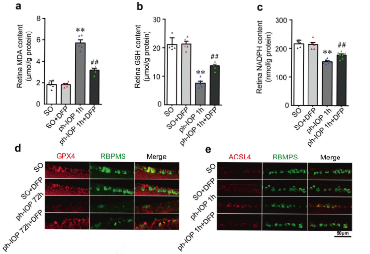3)指標檢測:視網(wǎng)膜氧化應激–丙二醛(MDA)、煙酰胺腺嘌呤二核苷酸磷酸酯還原形式(NADPH)和谷胱甘肽(GSH);高效液相色譜HLPC–檢測小鼠血清和視網(wǎng)膜的去鐵酮(DFP,脂溶性鐵螯合劑)給藥后的濃度;視網(wǎng)膜形態(tài)分析–H&E染色測量小鼠視網(wǎng)膜切片的形態(tài);鐵離子檢測–Perl’s染色法檢測視網(wǎng)膜各層中鐵的分布、使用Iron Assay Kit盒(MAK025;Sigma)測量血清和視網(wǎng)膜的鐵水平(總鐵、二價(jià)鐵和三價(jià)鐵);掃描透射電子顯微鏡TEM–測定RGCs具有鐵濃縮特征的線(xiàn)粒體。