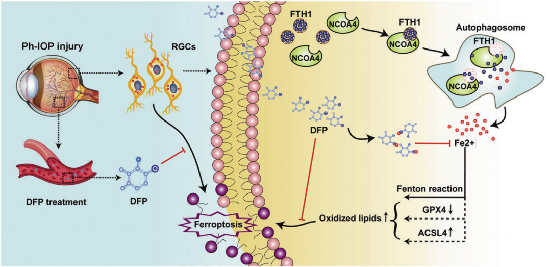 4. ph-IOP導致的鐵代謝紊亂可以通過(guò)增加視網(wǎng)膜促鐵死亡因子的表達,減少抑鐵死亡因子的表達誘導RGC發(fā)生鐵死亡,加重青光眼損傷;去鐵酮口服后可有效通過(guò)血-視網(wǎng)膜屏障,ph-IOP損傷后螯合視網(wǎng)膜內異常升高的二價(jià)鐵,抑制RGCs鐵死亡,保護視覺(jué)功能。