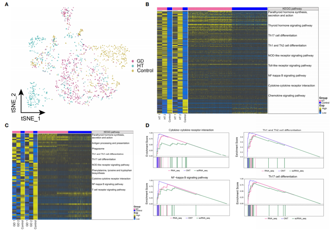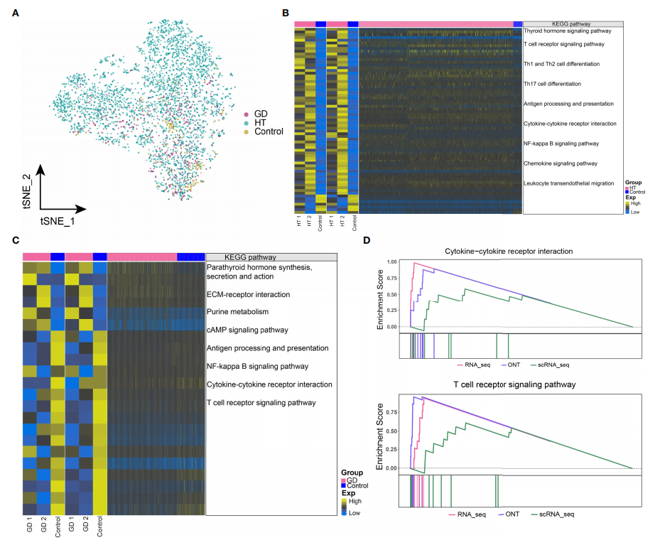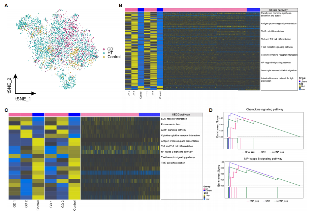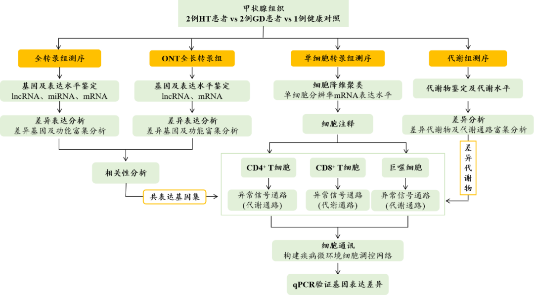 本研究基于HT患者、GD患者和健康對照甲狀腺組織的單細胞RNA測序、全轉錄組測序、ONT全長(cháng)轉錄組測序和代謝組測序數據,探討了HT和GD疾病微環(huán)境中基因表達失調和代謝信號異常的免疫細胞,構建了免疫細胞的全局調節網(wǎng)絡(luò ),為進(jìn)一步了解HT和GD免疫紊亂和代謝異常介導的疾病機制、更好地干預和治療疾病提供了科學(xué)的理論指導和研究基礎。