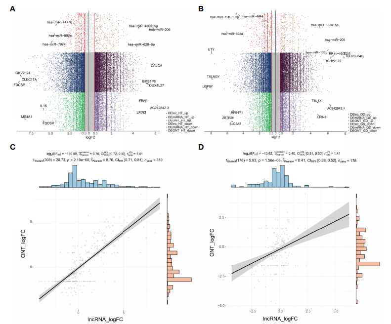 為了鑒定HT組和GD組中異常表達的lncRNA和miRNA,分別進(jìn)行了ONT全長(cháng)轉錄組測序和全轉錄組測序數據。差異表達分析結果顯示,共檢測到6,153?個(gè)?lncRNA?s和?741?個(gè)?miRNAs?在?HT?患者中存在差異表達(圖?1A);GD患者中檢測到5,492個(gè)lncRNAs?和?165?個(gè)?miRNAs?存在差異表達(圖?1B);相關(guān)性分析結果驗證了本研究中兩種測序方法的檢測穩定性(圖?1C,?D)。