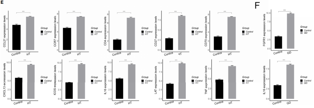 鑒于免疫反應在HT和GD中的重要作用,利用GSEA方法進(jìn)行免疫浸潤分析,進(jìn)一步評估了樣本中免疫細胞的豐度,發(fā)現CD4?+T細胞、CD8?+?T細胞、巨噬細胞、Th1和Th2細胞均有不同程度的浸潤(圖?2H)。