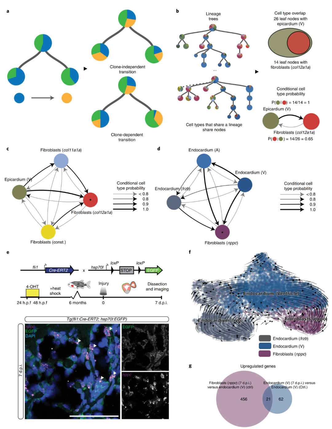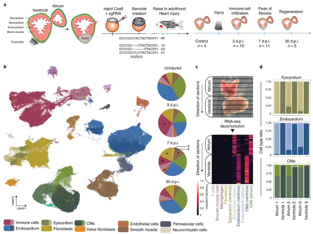 為了系統地識別健康和再生斑馬魚(yú)心臟中的細胞類(lèi)型,作者對損傷前后不同階段的大約20萬(wàn)個(gè)解離細胞進(jìn)行了scRNA-seq(圖1a)。為了準確得到細胞發(fā)育起源的相關(guān)信息,作者還應用了一種基于CRISPR–Cas9技術(shù)的大規模平行譜系追蹤方法,通過(guò)注射Cas9和針對多拷貝轉基因(斑馬魚(yú)系中的dTomato:一種用于斑馬魚(yú)細胞追蹤和譜系分析的多光譜細胞標記)的sgRNA,創(chuàng )建了作為譜系條形碼的“遺傳疤痕”來(lái)記錄早期發(fā)育中的譜系關(guān)系。