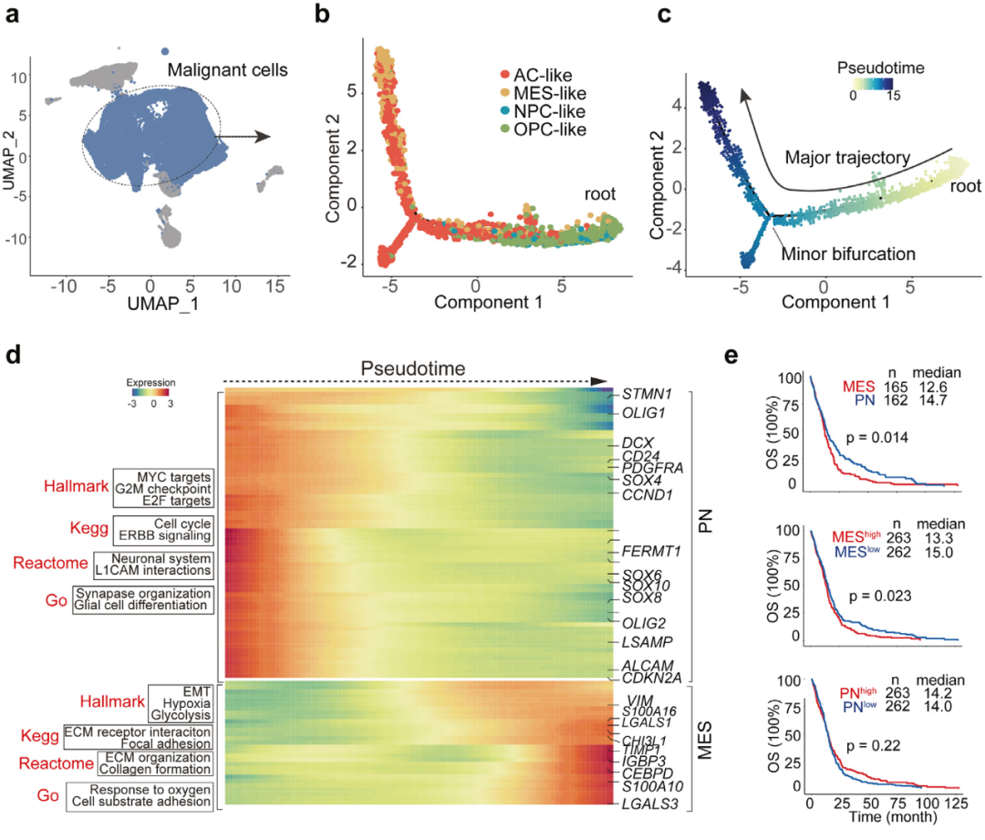 2、利用細胞軌跡分析和轉錄調控網(wǎng)絡(luò )分析預測到由特定TF調節的PN到MES細胞狀態(tài)轉換;