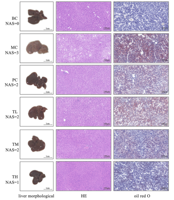 如圖1所示,與BC組相比,模型組大鼠肝臟脂肪堆積增多,肝臟體積增大,顏色變白,邊緣變鈍。給藥后,各組大鼠肝臟紅化程度均有不同程度的改善,尤以TH組為佳。HE和油紅O染色結果顯示,模型組大鼠肝組織內可見(jiàn)較多的球狀變性肝細胞和較多的紅色脂肪,而給藥組較少。MC組病理程度重,TH組輕,TL組與PC組之間無(wú)顯著(zhù)差異。因此,HRG可改善HFD誘導的肝臟脂肪堆積和體重增加,并且可能以劑量依賴(lài)的方式改善肝臟損傷。
