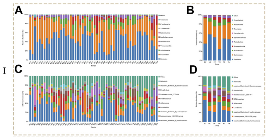 對糞便樣本進(jìn)行16s rRNA基因測序分析,在門(mén)、綱、目、科和屬的水平上對微生物群進(jìn)行了鑒定和分析,最終共鑒定到17門(mén)、26綱、56目、86科、187屬。主要物種為厚壁菌門(mén)和擬桿菌門(mén),其次是放線(xiàn)菌門(mén)、疣微菌門(mén)和變形菌門(mén)。此外,物種主要分布在uncultured_bacterium_f_Muribaculacea屬和lachnospiraceae NK4A136 group,其次是uncultured_bacterium_f_Lachnospirae、Lactobacillus和Akkermansia。