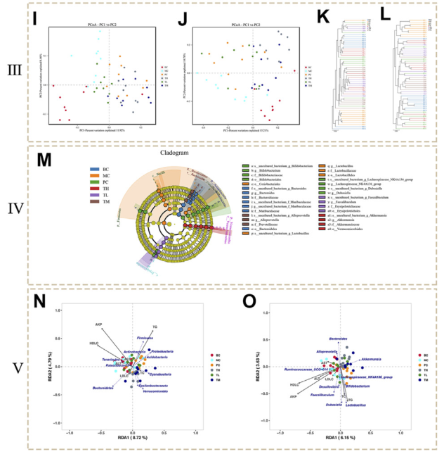 腸道菌群聚類(lèi)顯示BC組和MC組樣本微生物群落差異明顯,給藥組、BC組和MC組微生物群落差異顯著(zhù)。此外,Bray-Curtis PCoA 證實(shí)了這些發(fā)現(圖 3J)Curtis PCoA 證實(shí)了這些發(fā)現(圖 3J)。 PC1(15.21%)能較好地區分BC和MC組、MC和TM、TH組微生物群落。這些數據進(jìn)一步表明BC和MC組在微生物群落結構上存在較大差異,并且HRG施用組和對照組在微生物群落結構上存在較大差異。