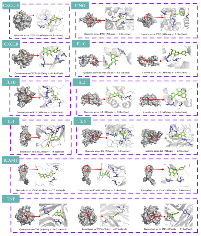 利用10個(gè)關(guān)鍵治療靶點(diǎn)、14個(gè)關(guān)鍵化合物和相關(guān)通路,通過(guò)Cytoscape構建了“藥草-關(guān)鍵化合物-潛在靶點(diǎn)-通路”的網(wǎng)絡(luò )圖(圖4H)。排名前三的化合物被選為潛在化合物(槲皮素、木犀草素、山柰酚)。選擇前三個(gè)信號通路作為關(guān)鍵通路。繪制了 HRG 通過(guò)腸道菌群治療 NAFL 的通路機制(圖 4I)。將10個(gè)關(guān)鍵靶點(diǎn)與3個(gè)潛在化合物進(jìn)行分子對接,共獲得18對對接結果(表4),使用 Pymol 可視化結果(圖 5)。