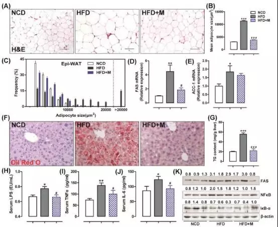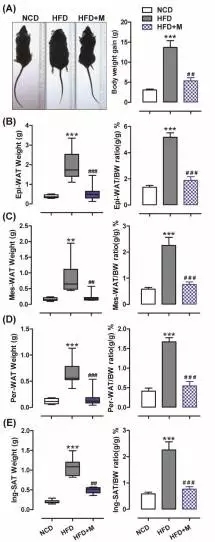 1)?HFD組小鼠體重顯著(zhù)增加,而HFD+褪黑素組小鼠體重得到有效控制,如下圖A。