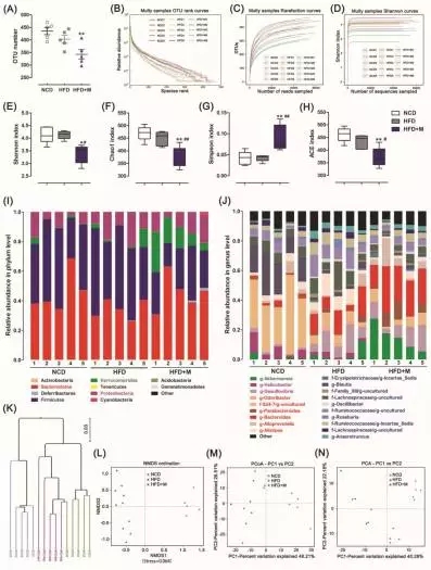 4)?UPGMA、NMDS、PCA、PCoA分析,發(fā)現褪黑素顯著(zhù)改變了腸道菌群的結構,如下圖K-N。