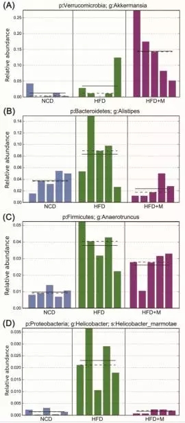 2) LEfSe分析,發(fā)現褪黑素顯著(zhù)提高Akkermansia的相對豐度,Akkermansia即是降低高脂肪膳食小鼠體重的有益菌。而褪黑素顯著(zhù)降低Alistipes、Anaerotruncus、Helicobacter?marmotae的相對豐度,則這三種細菌預防肥胖的有害菌??傊?,褪黑素能夠使高脂肪膳食小鼠的腸道菌群由失調狀態(tài)轉為正常狀態(tài),從而抑制體重的增加。