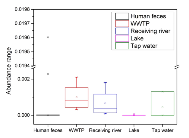 借助人類(lèi)糞便指示劑 crAssphage (CPQ_056),分析了人類(lèi)糞便排放對當地水環(huán)境中ARGs的影響。結果表明,crAssphage在所有環(huán)境樣品中的檢測頻率為 68.2%,相對豐度范圍為2.68×10-6至1.96×10-2每個(gè)16S rRNA基因拷貝(圖2),表明超過(guò)一半的水樣(湖水、自來(lái)水、污水處理廠(chǎng)和受納河水)被人類(lèi)糞便污染。與 ARGs 一致,平均crAssphage 豐度也沿著(zhù)水流從污水處理廠(chǎng)不同處理單元的污水到受納河水再到湖泊水體的順序逐漸減少(圖2)。這再次證明了人類(lèi)糞便污染從污水處理廠(chǎng)的排放源到接收環(huán)境有著(zhù)隨距離不斷衰減的效應。