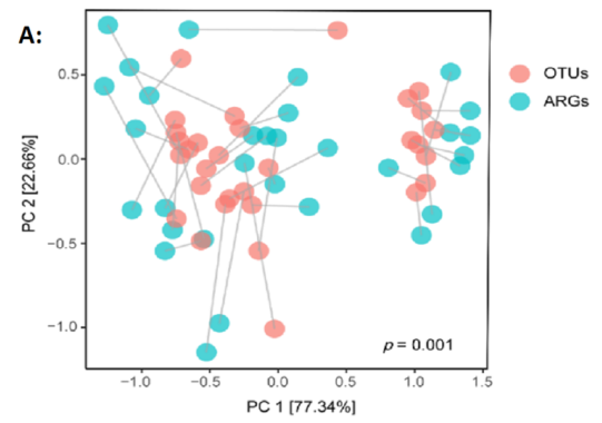 圖6.不同樣品中細菌群落與ARGs的相關(guān)性。(1)ARGs和細菌群落的Procrstes分析(2)細菌門(mén)和ARGs之間的網(wǎng)絡(luò )分析