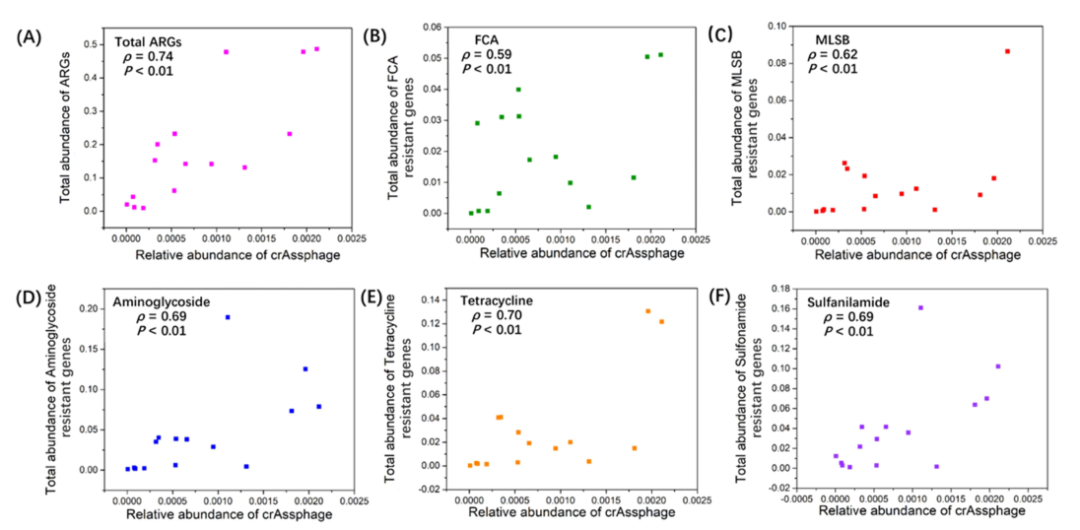 圖3.按目標抗生素分類(lèi)的ARGs總豐度與水樣中crAssphage豐度之間的相關(guān)性