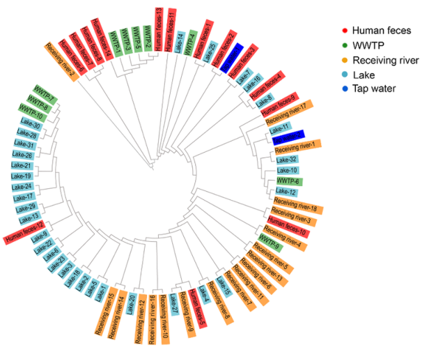 除了crAssphage 之外,研究者通過(guò)構建系統發(fā)育樹(shù)分析了來(lái)自所有樣品的氨芐青霉素抗性菌株中的 blaTEM-1基因序列(圖4)。結果表明,來(lái)自四種環(huán)境樣品(湖水、自來(lái)水、污水處理廠(chǎng)和受納河水)的blaTEM-1與腸道樣品的進(jìn)化關(guān)系密切(圖4)。該結果表明blaTEM-1可能通過(guò)污水排放在人類(lèi)糞便和受納水體之間進(jìn)行傳播。然而,需要進(jìn)一步的研究來(lái)驗證這些發(fā)現。