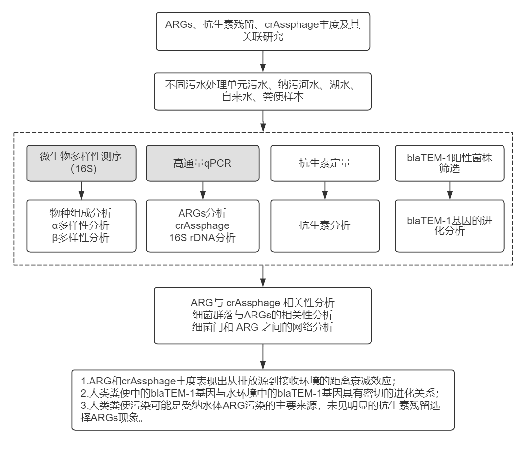 環(huán)境中細菌的抗生素耐藥性由于與臨床病原體的抗生素耐藥性密切相關(guān)而受到越來(lái)越多的關(guān)注。自從人類(lèi)在臨床上使用抗生素以來(lái),環(huán)境中的抗生素耐藥基因(ARGs)亦有所增加。然而,這種增加是否直接來(lái)源于環(huán)境殘留抗生素的選擇性壓力還是來(lái)源于人類(lèi)大量排放的糞便污染卻不得而知。在該項研究中,調查了人類(lèi)糞便以及受人類(lèi)糞便污染影響的不同污水處理廠(chǎng)受納水環(huán)境中的 ARGs、crAssphage 和抗生素殘留特征,以期了解抗生素的選擇壓力和人類(lèi)糞便污染對受納水體ARGs污染的影響。