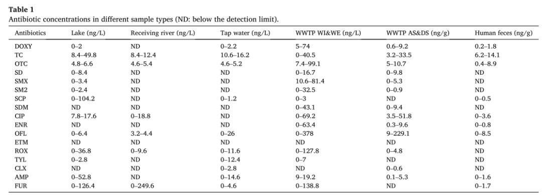 表1.不同樣品類(lèi)型中的抗生素濃度(ND:低于檢測限值)。
