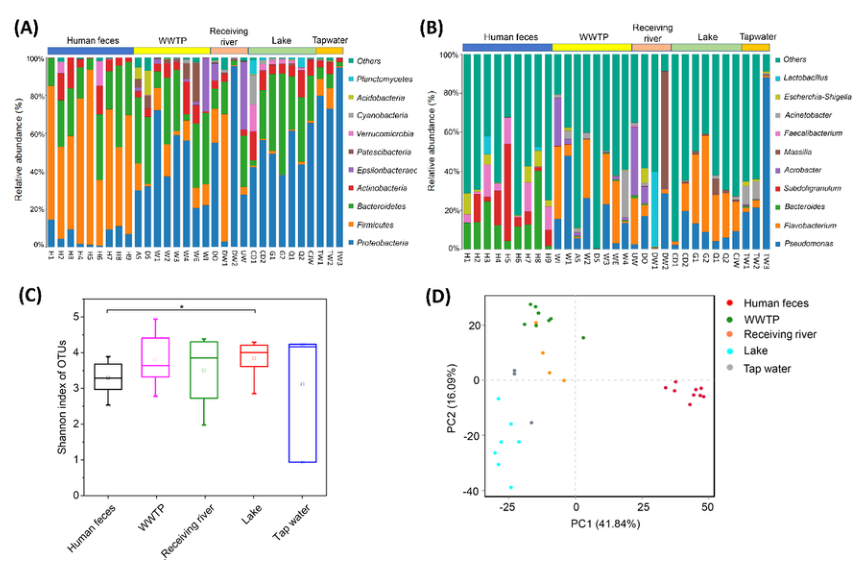 在人類(lèi)糞便中,厚壁菌門(mén)、擬桿菌門(mén)、變形桿菌門(mén)和放線(xiàn)菌門(mén)是優(yōu)勢門(mén)(圖5A)。厚壁菌和擬桿菌占腸道菌群總數的(83.5±9.8)%,環(huán)境樣品中以變形桿菌和擬桿菌為主,變形桿菌所占比例高。在屬的水平上,人類(lèi)的腸道Bacteroides,Faecalibacterium,Bifidobacterium, 和Subdoligranulum.Pseudomonas,而水環(huán)境中的優(yōu)勢屬為Flavobacterium,Arcobacter和Massilia(圖5B)。