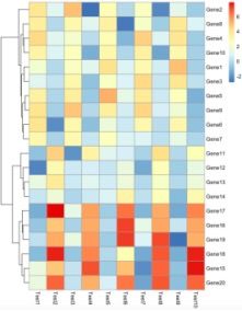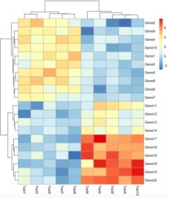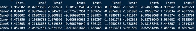 為了模擬不同樣品和基因之間的差異,我們將第一行到第10行中奇數列的數值全部加3,將第11行到第20行的偶數列數值全部加2,將15行到20行的偶數列全部加4。最后將列名命名為T(mén)est1 ~ Test10,將行名命名為Gene1~Gene 20,最終生成的數據格式如下圖