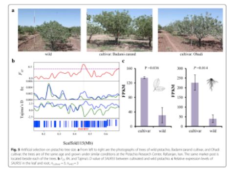 群體核苷酸多態(tài)性θπ分析揭示了馴化型種質(zhì)的核苷酸多態(tài)性低于野生型種質(zhì),通過(guò)分析發(fā)現,栽培種質(zhì)中基因組上的一些區域的多態(tài)性降低,這些區域可能含有受到人工選擇的基因。此外,研究人員鑒定了栽培型和野生型樣品分化水平增加的區域。在馴化和野生的開(kāi)心果之間,在基因組上約有9.2 Mb的區域被鑒定為具有高水平的群體分化。栽培種間遺傳多樣性降低,且超過(guò)95%的閾值。遺傳多樣性減少的區域和群體分化增強的區域在馴化或育種過(guò)程中經(jīng)歷了選擇性清除。共計有665個(gè)基因定位在該區域。研究人員定位了受正向選擇的候選基因,其可能與馴化過(guò)程中重要的表型進(jìn)化相關(guān)。在開(kāi)心果馴化的過(guò)程中,其樹(shù)形大小經(jīng)歷了人工選擇(圖5a)。研究人員發(fā)現了基因SAUR55(圖5b),編碼生長(cháng)素應激蛋白,在植物的生長(cháng)過(guò)程中發(fā)揮重要的作用,其在開(kāi)心果的人工選擇下進(jìn)化而來(lái)。除此之外,基于也和根的轉錄組數據分析結果顯示,馴化種與野生種相比,基因SAUR55表現出了顯著(zhù)增加的表達水平(圖5c)。這些結果與在其它作物(如水稻和小麥)中生長(cháng)素應激性基因的選擇性清除的研究結果一致,并揭示了在作物馴化期間類(lèi)似特征性狀的人工選擇。果實(shí)重量是作物馴化和育種期間最重要的特征之一,包括開(kāi)心果。在栽培種中,品種成分與果實(shí)重量呈正相關(guān)(圖4e)。這支持了一個(gè)結論,在開(kāi)心果中,果實(shí)重量的人工選擇發(fā)生在馴化與人工選擇期間。研究人員指出,基因CYCD7-1在人工選擇的進(jìn)化下,野生種和馴化的栽培種之間具有高度的群體分化特征。該基因編碼D型細胞周期蛋白,控制細胞分裂及種子發(fā)育過(guò)程中的生長(cháng)率。CYCD7-1基因的過(guò)表達包括在胚胎和胚乳中的細胞增殖和細胞增大,其在擬南芥中導致種子過(guò)度生長(cháng)?;?em>CYCD7-1在花粉和早期發(fā)育中顯示特殊表達,但在葉和根中沒(méi)有表達。因此,有希望在未來(lái)的實(shí)驗中比較野生型和馴化型開(kāi)心果在花粉和早起發(fā)育時(shí)期CYCD7-1基因的表達,研究人員提出在CYCD7-1基因上進(jìn)行的人工選擇可能會(huì )改變開(kāi)心果的重量。