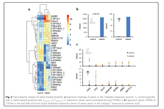進(jìn)一步研究開(kāi)心果的耐鹽性潛在遺傳機制,研究者進(jìn)行了鹽度實(shí)驗。開(kāi)心果砧木(P.vera?L.cv.Ohadi)的葉和根在正常條件和鹽度條件下進(jìn)行RNA測序。使用Tophat-Cufflinks-Cuffdiff?pipeline,在鹽水條件下處理的植物與對照之間表現出差異表達,鑒定214和461蛋白質(zhì)編碼基因分別在葉和根組織中(ncontrol = 3, nsalinity = 3, corrected P < 0.05,)?;蚋患治霭l(fā)現許多差異表達基因(31個(gè)基因)參與到“氧化還原進(jìn)程”中(圖2a,b)。像比較基因組分析一樣,該類(lèi)別中的15個(gè)基因是細胞色素P450基因,特別是CYP74A(即AOS),其編碼細胞色素P450 CYP74基因家族的一個(gè)成員,其起到丙二烯氧化物合酶(AOS)的作用。這種酶催化茉莉酸酯合成中的第一步[即茉莉酸(JA)]。AOS中每千堿基外顯子的表達片段(FPKM)值在葉片中從對照中的近0增加到鹽水條件下的2163.75,在根中從對照中的1.87增加到鹽水處理的87.74。研究者還發(fā)現了7個(gè)差異表達的基因(ChiC, TT4, ILL6, MYB108, MYB6, PRB1, and TIFY5A)被富集到“茉莉酸反應”中。以前的研究表明,干旱和高鹽度導致水稻葉片和根部JA含量增加。鹽度處理可以增加濕地物種鳶尾(Iris hexagona)中的內源JA水平。茉莉酸酯激活植物對生物脅迫(即病原體攻擊)和非生物脅迫(即鹽)的反應。在此,用鹽水處理增加了在葉和根中參與茉莉酸反應的這些基因的表達水平(圖2c)。這些基因的表達增加(例如,AOS作為酶催化茉莉酸酯合成中的第一步)應該增加茉莉酮酸酯的合成,因此,它們很可能被開(kāi)心果用于應對鹽脅迫。