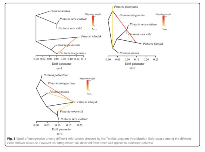 為了研究開(kāi)心果的種群歷史和適應性進(jìn)化,研究者對107個(gè)開(kāi)心果基因組進(jìn)行重測序,包括93個(gè)品種和14個(gè)野生開(kāi)心果,平均測序深度為6-8X。作者還重新測序了來(lái)自不同近緣種的35個(gè)基因組,包括P.mutica,P.khinjuk,P.integerrima和P. palaestina。用stringent GATK pipeline,發(fā)現14.77百萬(wàn)個(gè)單基因變異位點(diǎn),其中2.42百萬(wàn)個(gè)在基因區。使用鄰近法和最大似然法的系統發(fā)育分析清楚地分離了5種不同的種群,即?P.vera, P.mutica, P. khinjuk, P. integerrima, and P. palaestina。通過(guò)TreeMix程序在一些物種之間檢測到漸滲的信號,這表明雜交可能在自然界中的不同近親之間發(fā)生,并且與植物中被發(fā)現的普遍雜交一致。然而,從其他開(kāi)心果物種到馴化的開(kāi)心果沒(méi)有檢測到漸滲,這種現象來(lái)源于野生的P. vera(圖3)。