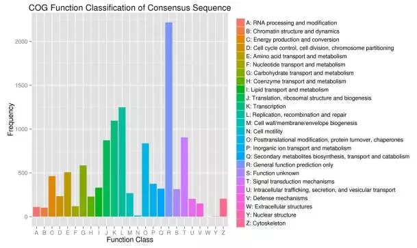 2.用BLASTX將組裝得到的序列與Nr,Swiss-Prot,GO,COG和KEGG數據庫進(jìn)行比對,共有8288個(gè)Unigenes注釋到了25個(gè)COG類(lèi)別中的11713個(gè)功能。有585個(gè)Unigenes注釋到“碳水化合物的運輸和代謝”。