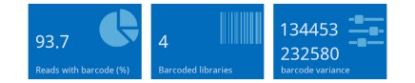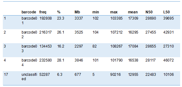 在加入barcode序列混樣測序的情況下,barcode識別區分的結果展示如下,包括barcode識別效率,區分的文庫個(gè)數及每個(gè)文庫中序列個(gè)數占比和長(cháng)度信息等。