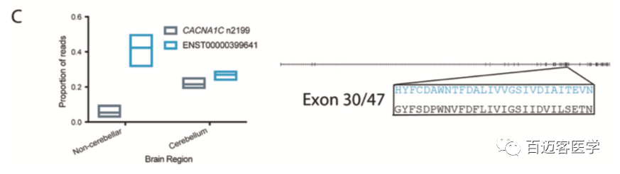 小腦、紋狀體與皮質(zhì)等組織觀(guān)察到了CACNA1C轉錄本差異,但在不同個(gè)體之間的表達是相似的。在小腦中觀(guān)察到了明顯的轉錄本表達轉換;在小腦之外,ENST00000399641是主要的轉錄本,而在小腦中,ENST00000399641和CACNA1C n2199的表達水平相似。