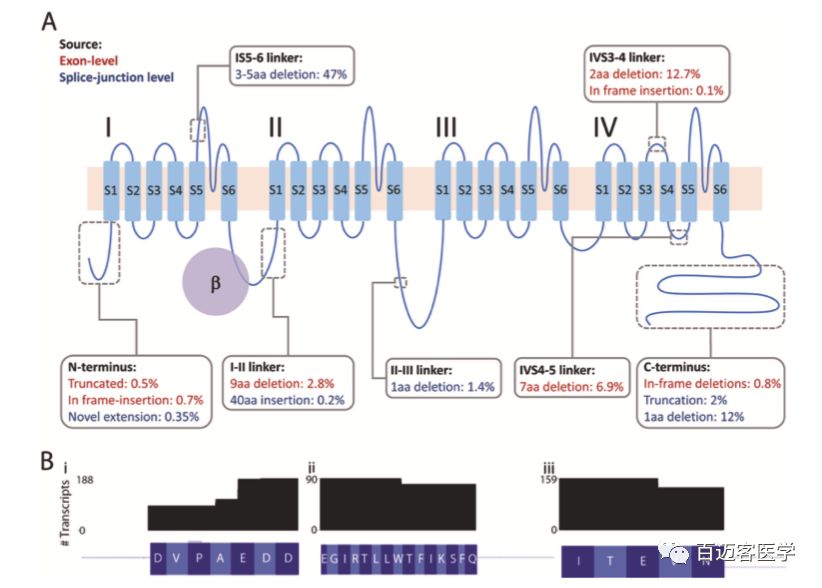 CACNA1C編碼CaV1.2 的主要成孔亞基。鈣孔由24個(gè)跨膜重復序列組成,由細胞內環(huán)連接成4個(gè)結構域(I-IV)(圖4A)。在我們鑒定的83個(gè)新的外顯子水平的轉錄本中,51個(gè)可能編碼功能性的CaV1.2通道?;疑娇虮硎拘碌?、框架內的插入和刪除的位置(值表示包含每個(gè)isoforms的reads的平均比例)。使用兩種分析方法(外顯子水平和剪切連接水平)鑒定變體的情況,外顯子水平計數用于得出豐度(紅色文本);僅使用剪接位點(diǎn)水平方法鑒定的變體用藍色文本表示。包含三個(gè)微缺失的蛋白質(zhì)異構體的數量:(I)在I-II接頭中,(Ii)在IV4-5接頭中,以及(Iii)在IV3-4接頭中先前報道的微缺失(圖4B)。