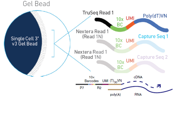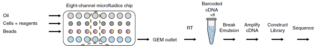 10 X Genomics單細胞轉錄組測序平臺利用微流控、油滴包裹和baecode標記等技術(shù)來(lái)實(shí)現高通量的細胞捕獲技術(shù),能夠一次性分離、并標記500–10000個(gè)單細胞,從而獲得每個(gè)細胞的3’端的轉錄組信息。具有細胞通量高、建庫成本低、捕獲周期短等優(yōu)勢。該技術(shù)主要用于細胞分型和標記因子的鑒定,從而實(shí)現對細胞群體的劃分與細胞群體間基因表達差異的檢測,此外該技術(shù)還可以預測細胞分化與研究發(fā)育軌跡,在當下疾病、免疫、腫瘤領(lǐng)域以及組織、器官、發(fā)育研究中發(fā)揮越來(lái)越重要的作用。