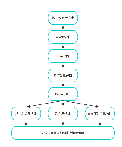 雙端測序數據通過(guò)評估雙端測序數據通過(guò)評估(GC分布統計、質(zhì)量值Q20、Q30評估)、過(guò)濾后得到高質(zhì)量的數據(clean reads),用于基因組大小的評估、基因組的組裝、GC含量的統計、雜合率的統計(以及組裝后的評估)。具體信息分析流程見(jiàn)圖2。