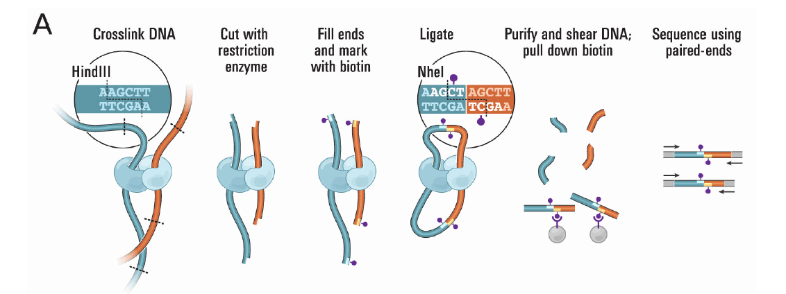 Hi-C建庫測序實(shí)驗采用Hi-C的類(lèi)型是in situ Hi‐C,主要包括細胞交聯(lián)、內切酶酶切、末端修復、環(huán)化、DNA純化及捕獲和二代上機測序等步驟。
