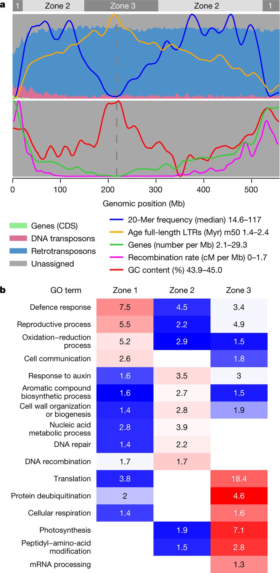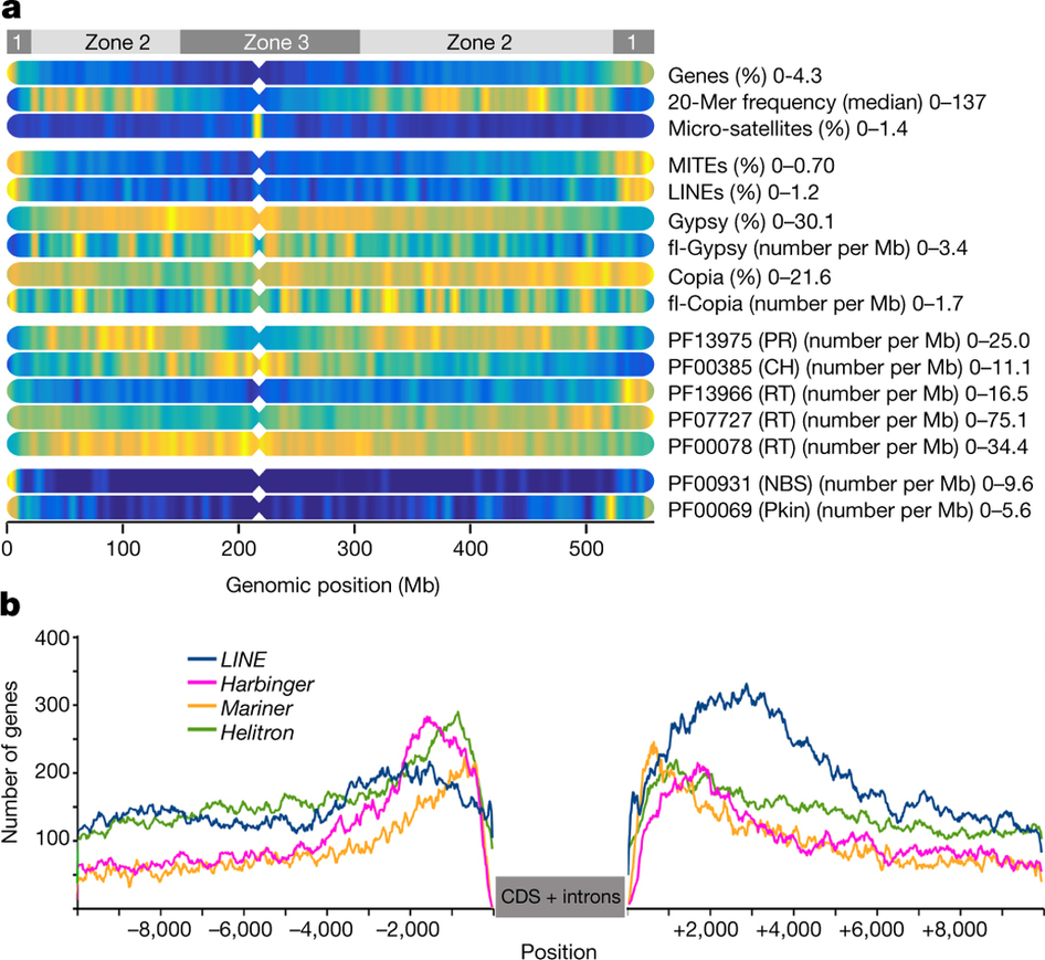 利用染色體位置信息,通過(guò)對20-mer頻率將染色體進(jìn)行劃分成了三種區域,每種區域上在基因密度,重組率,LTR插入時(shí)間以及GC含量上都存在一定的規律。