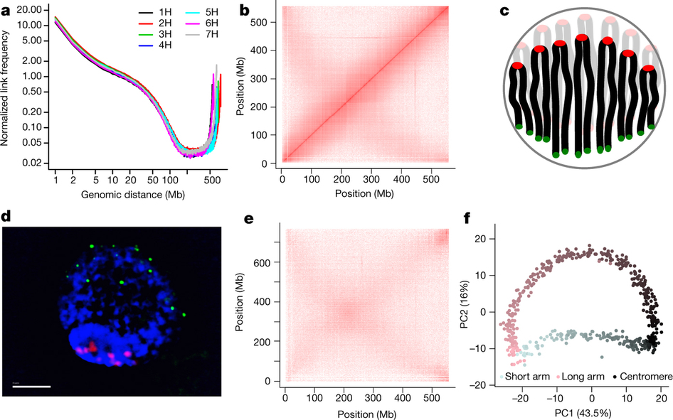 通過(guò)HIC熱圖作者發(fā)現無(wú)論是染色體內部還是染色體間的長(cháng)短臂之間都存在較強的交互信號。按照HIC的原理來(lái)說(shuō),染色體上空間作用越強則實(shí)際DNA間的物理距離越近,染色體大小臂及不同染色體間的相互作用應該是極弱的。為了找出原因,作者通過(guò)對大麥葉核間期的細胞進(jìn)行著(zhù)絲粒及端粒熒光雜交,發(fā)現所有染色體的端粒和著(zhù)絲粒在空間上的位置都純在極性,且排列方式也極其相似,不同染色體間的大小臂其實(shí)在空間上距離很近,因此確實(shí)存在染色體內外大小臂之間大量的交互作用的可能。