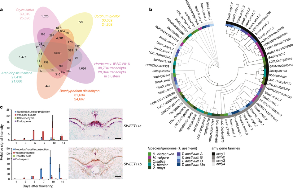 通過(guò)對大麥基因組進(jìn)行基因家族收縮擴張分析發(fā)現,收縮擴張的家族中*顯著(zhù)的部分都與植物防御及抗病相關(guān)。另外,作者對麥芽品質(zhì)相關(guān)的amy家族及糖代謝相關(guān)的SWEET家族進(jìn)行了亞家族分類(lèi),多倍化及表達模式相關(guān)的分析。