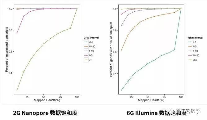 針對同一樣本進(jìn)行的飽和度分析顯示,2G ONT全長(cháng)除表達量極低的(CPM<1)其他轉錄本都達到飽和了,和二代Illumina 6G除表達量極低FPKM<1外的基因檢測也飽和了,且前者更早趨向飽和;