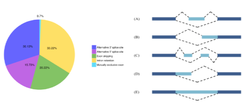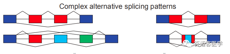 基因轉錄生成的前體mRNA(pre-mRNA),有多種剪接方式,選擇不同的外顯子,產(chǎn)生不同的成熟mRNA,從而翻譯為不同的蛋白質(zhì),構成生物性狀的多樣性。這種轉錄后的mRNA加工過(guò)程稱(chēng)為可變剪接或選擇性剪接(Alternative splicing)??勺兗艚宇?lèi)型包括:(A) 外顯子跳躍;(B) 可變轉錄終止位點(diǎn);(C) 可變外顯子;(D)可變轉錄起始位點(diǎn);(E) 內含子保留。