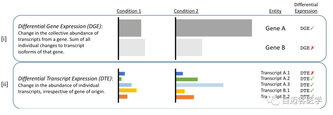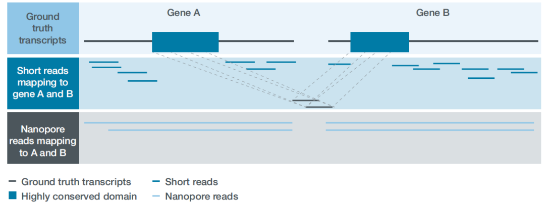 注:上圖中藍色方塊表示測到RNA序列中能夠比對到基因組序列的區域,即屬于某個(gè)轉錄本外顯子區的reads;灰色線(xiàn)條表示我們測到的reads回比基因組序列時(shí)中間沒(méi)有比對上的,則用灰色線(xiàn)條連接,即reads不連續比對,中間被剪接掉的內含子區。從圖中明顯看出,二代短reads比較短,多數短read單條連一個(gè)外顯子區都跨越不了,nanopore長(cháng)讀長(cháng)測序可以直接得到3種全長(cháng)轉錄本。其中,Exon2和Exon6以及Exon9是三個(gè)轉錄本間共享的,那么對于完全比對到這3個(gè)外顯子區的短reads無(wú)法區分其來(lái)源轉錄本。而三代測序則直接跨越三個(gè)全長(cháng)轉錄本,因此對于轉錄本水平表達定量更準確。