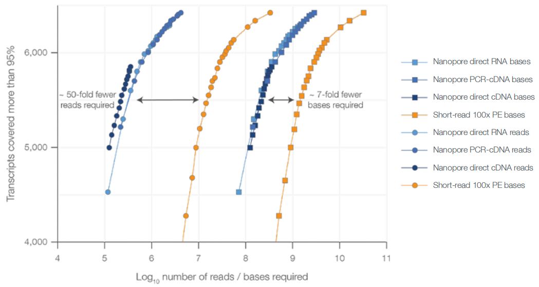 ONT全長(cháng)轉錄組測序一條reads即代表該轉錄本表達一次,而二代短reads需要非常多條才能覆蓋一個(gè)轉錄本;oxford nanopore公司官方白皮書(shū)中數據顯示:當相同數量的轉錄本被覆蓋達95%時(shí),ONT所需要的reads數比Illumina約少50倍,所需要堿基數約少7倍。