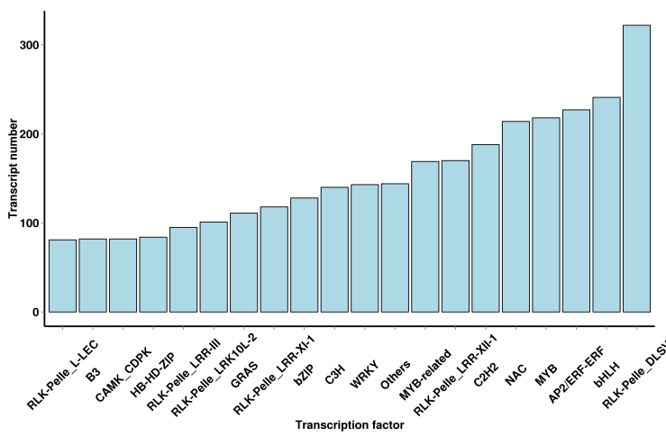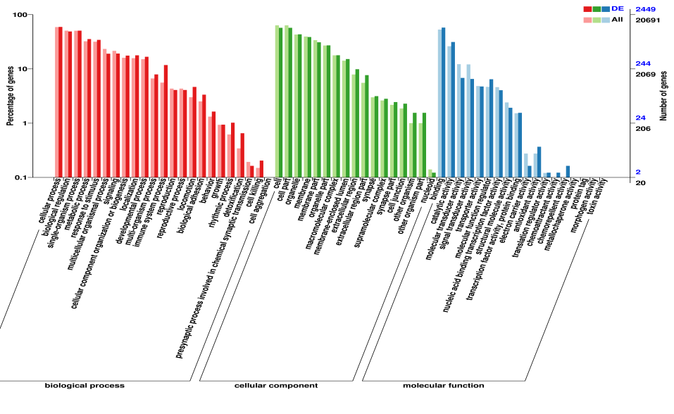 GO注釋分類(lèi)統計圖,直觀(guān)的反映出在生物過(guò)程(biological process)、細胞組分(cellular component)和分子功能(molecular function),可深入挖掘差異基因和轉錄本的功能及所在的信號通路,篩選關(guān)注差異基因和轉錄本注釋情況。