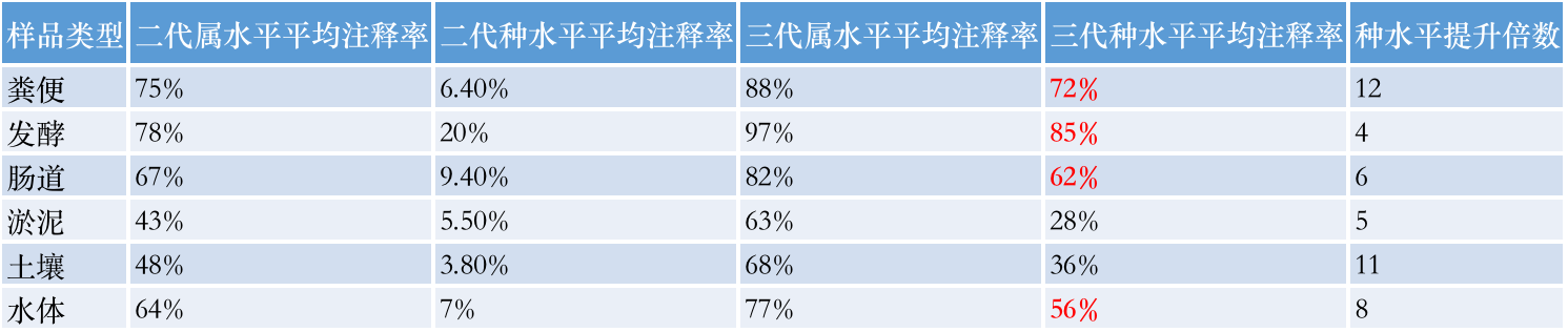 我們對不同類(lèi)型的樣品如:土壤、糞便、腸道、水體等,隨機挑選了30個(gè)項目對其進(jìn)行物種注釋率進(jìn)行研發(fā)優(yōu)化,目前采用優(yōu)化數據庫及注釋方法的策略,將其種水平平均注釋率提升到60%+。二代注釋到屬和種的平均比例為78%和6%,相同樣品采用三代進(jìn)行注釋時(shí),屬和種水平平均注釋率為95%和60%,注釋結果提升非常明顯。