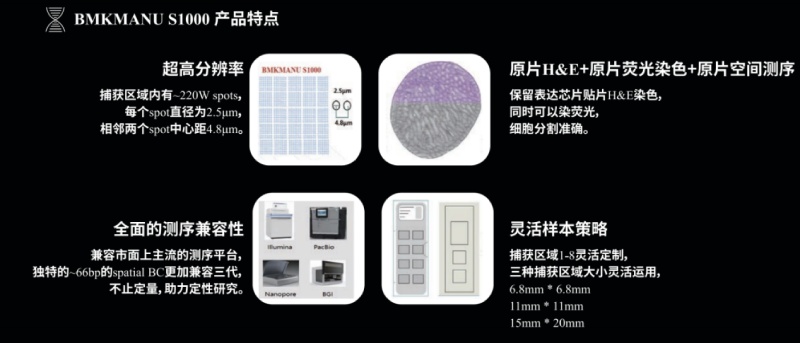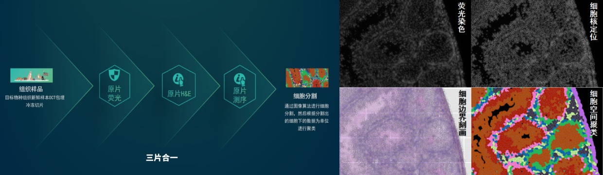 百創(chuàng )智造S系列空間轉錄組細胞分割實(shí)現原理: 三圖合一 百創(chuàng )智造基于S系列空間芯片的底層設計,開(kāi)發(fā)出了自己的核心技術(shù),可以得到完全沒(méi)有錯誤的原片熒光圖像以及H&E圖像且與芯片完全對齊?;跓晒膺M(jìn)行細胞核的定位刻畫(huà)細胞核的邊界;基于HE的校準輔助刻畫(huà)細胞的邊界,通過(guò)邊界信息映射到芯片上,提取相應位置的測序數據,實(shí)現精準的單細胞分割。